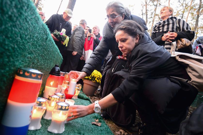 Menschen legen Kerzen vor einem Grab ab, um während einer Zeremonie zum Beginn der Beisetzung der sterblichen Überreste von etwa 800 Menschen, die nach dem Zweiten Weltkrieg von den kommunistischen Streitkräften getötet wurden, im Dobrava Memorial Park in Maribor Respekt zu zollen