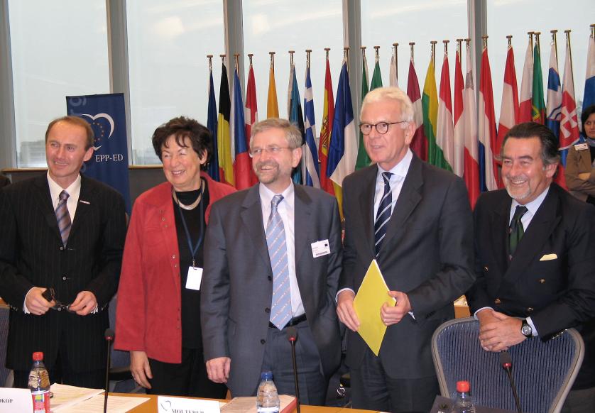 5. Gipfeltreffen der Fraktionsvorsitzenden der EVP-Mitgliedsparteien v.l.: Liese Prokop, österreichische Innenministerin, Wilhelm Molterer, Vorsitzender der ÖVP-Fraktion im österreichischen Parlament, Hans-Gert Pöttering MdEP (Deutschland), Vorsitzender der EVP-ED-Fraktion im Europäischen Parlament, Niels Pedersen, Generalsekretär der EVP-ED-Fraktion, João de Deus Pinheiro MdEP (Portugal), erster stellv. Vorsitzender der EVP-ED-Fraktion, und Othmar Karas MdEP (Österreich), stellv. Vorsitzender der EVP-ED-Fraktion