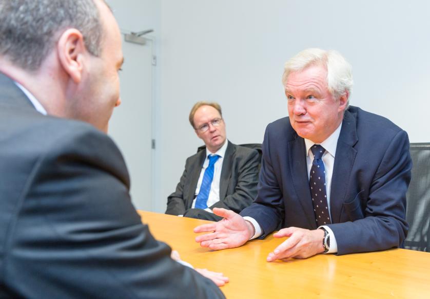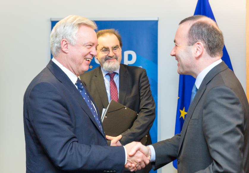 Der Europaabgeordnete Manfred Weber (Deutschland, CSU), Vorsitzender der EVP-Fraktion im Europäischen Parlament (rechts), David Davis, Parlamentarier, britischer Minister für den Austritt aus der Europäischen Union (links), und Martin Kamp, Generalsekretär der EVP-Fraktion