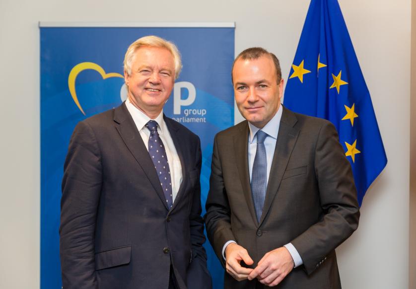 Der Europaabgeordnete Manfred Weber (Deutschland, CSU), Vorsitzender der EVP-Fraktion im Europäischen Parlament (mit dem Rücken zur Kamera), und David Davis, Parlamentarier, britischer Minister für den Austritt aus der Europäischen Union