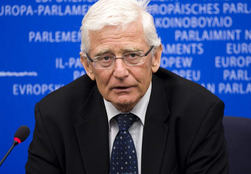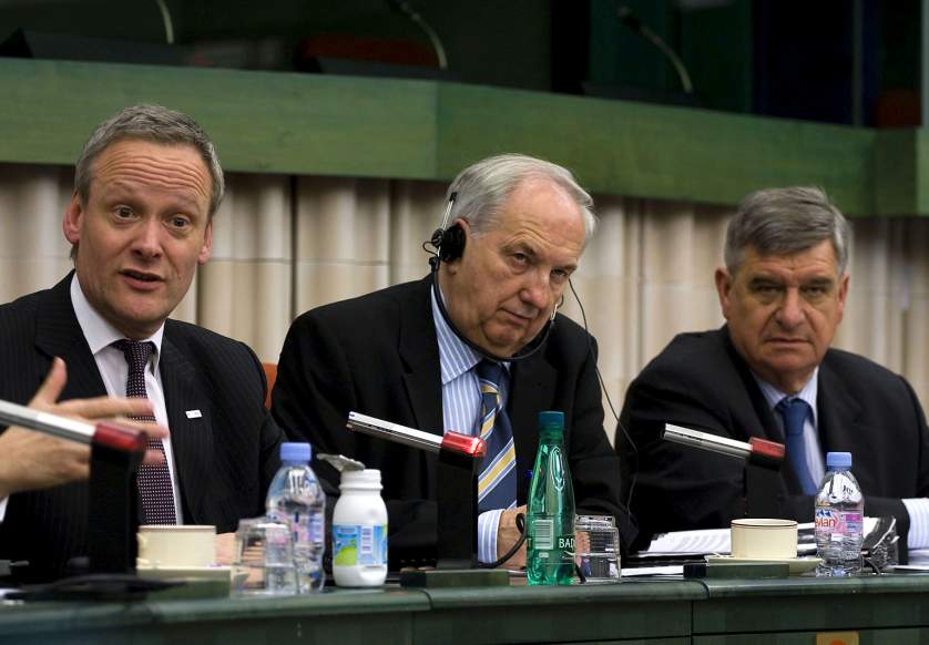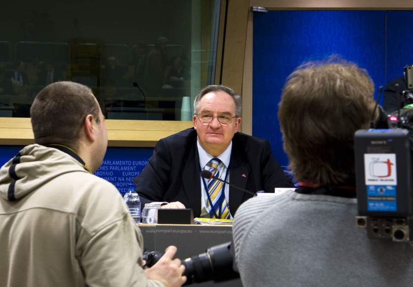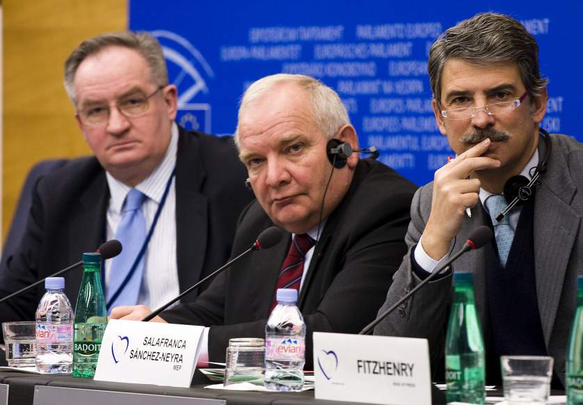 Briefing der EVP-ED-Fraktion Joseph Daul MdEP (Frankreich), Vorsitzender der EVP-ED-Fraktion im Europäischen Parlament (Mitte), Jacek Saryusz-Wolski MdEP (EVP-ED-Polen), Vorsitzender des Ausschusses für auswärtige Angelegenheiten des Europäischen Parlament, und José Ignacio Salafranca Sánchez-Neyra MdEP (EVP-ED, Spanien)