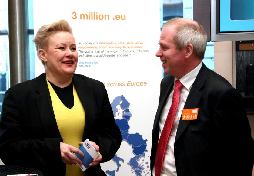 Ausstellung zum Erfolg der europäischen Domain-Endung ".eu" und die dreimillionste Registrierung für diese Internet-Adresse Sirpa Pietikäinen MdEP (EVP-ED, Finnland), Gastgeberin der Ausstellung, mit Marc Van Wesemael, General-Manager von EURid (European Registry of Internet Domain Names)