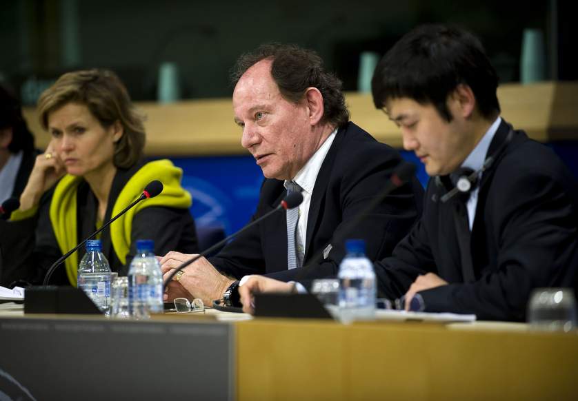Pressekonferenz über 'Informationsfreiheit in China: Streit um chinesischsprachigen Satellitensender NTDTV' Edward McMillan-Scott MdEP (EVP-ED, Vereinigtes Königreich), Vizepräsident des Europäischen Parlaments (Mitte), Lixin Yang, Brüsseler Vertreter von NTDTV (New Tang Dynasty Television), und Helga Trupel MdEP