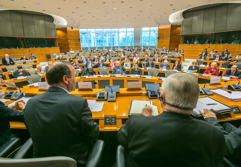 v.l.n.r.: Jorge Nuño Mayer, Generalsekretär von Caritas Europa, MdEP Jan Olbrycht, Leiter der polnischen Delegation der EVP-Fraktion im Europäischen Parlament, Msgr. Alain Paul Lebeaupin, Apostolischer Nuntius bei der Europäischen Union, MdEP Manfred Weber (Deutschland), EVP-Fraktionsvorsitzender, und MdEP Mariya Gabriel (Bulgarien), stellvertretende Vorsitzende der EVP-Fraktion, verantwortlich für Mittelmeerpolitik