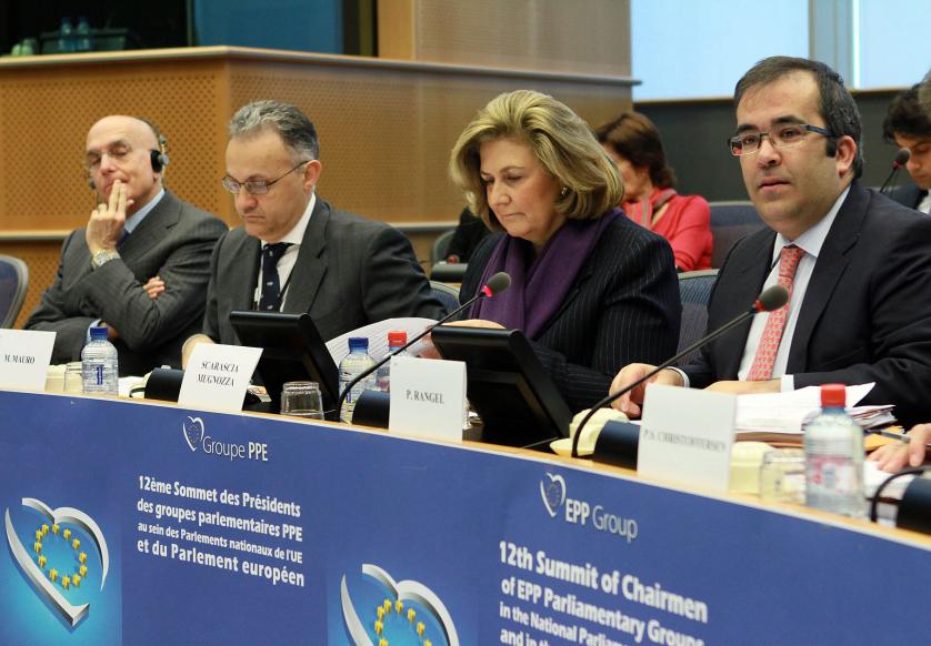 12ème Sommet des Présidents des groupes parlementaires PPE au sein des Parlements nationaux de l'UE Paulo Rangel, MdPE (Portugal), Vice-président du Groupe PPE au Parlement européen chargé des relations avec les Groupes parlementaires des Parlements nationaux (au centre), (de gauche à droite) Gabriele Albertini, MdPE (Groupe PPE, Italie), Président de la commission des affaires étrangères du Parlement européen, Mario Mauro, MdPE, Chef de la délégation italienne (PDL) du Groupe PPE, Beatrice Scarascia Mugnozza, Secrétariat du Groupe PPE, Poul Skytte Christoffersen, Conseiller Spécial du Haut Représentant de l'Union pour les affaires étrangères et la politique de sécurité, Elmar Brok, MdPE (Groupe PPE, Allemagne), Rapporteur pour la commission des affaires étrangères, et Alejandro Muñoz-Alonso Ledo, Porte-parole du Groupe Partido Popular au sein du Sénat espagnol et membre de la Commission mixte pour l'Union européenne