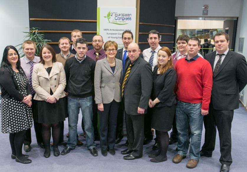 Mairead McGuinness, MdPE (Irlande), Vice-présidente du Groupe PPE au Parlement européen (premier rang, au centre), entourée des jeunes agriculteurs de l'année 2014