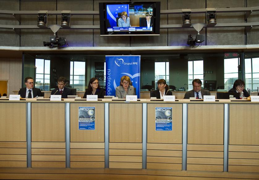 Audition du Groupe PPE sur 'la politique européenne de lutte contre la corruption pour un avenir durable' de gauche à droite: Tobias Kaiser, journaliste de 'Die Welt', Simon Busuttil, MdPE (Malte), Coordinateur du Groupe PPE au sein de la commission des libertés civiles, de la justice et des affaires intérieures du Parlement européen, Cecilia Malmström, Commissaire européenne chargée des Affaires intérieures, Corien Wortmann-Kool, MdPE (Pays-Bas), Vice-présidente du Groupe PPE, Monica Luisa Macovei, MdPE (Groupe PPE, Roumanie), organisatrice de l'audition, Hans Nilsson, Chef de division, Coopération judiciaire, Secrétariat général du Conseil de l'Union européenne, et Alina Mungiu-Pippidi, école de gouvernance Hertie, Allemagne