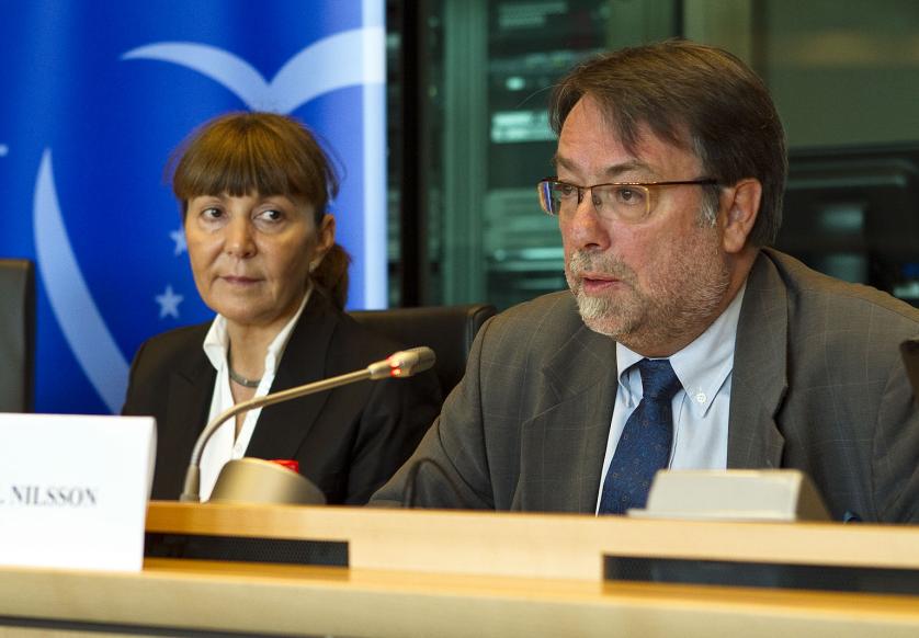 Audition du Groupe PPE sur 'la politique européenne de lutte contre la corruption pour un avenir durable' Monica Luisa Macovei, MdPE (Groupe PPE, Roumanie), organisatrice de l'audition (à gauche), et Hans Nilsson, Chef de division, Coopération judiciaire, Secrétariat général du Conseil de l'Union européenne