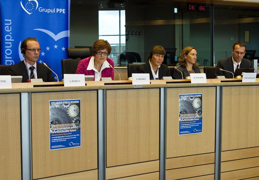 Audition du Groupe PPE sur 'la politique européenne de lutte contre la corruption pour un avenir durable' de gauche à droite: Algirdas Šemeta, Commissaire européen chargé de la fiscalité, de l'union douanière, de l'audit et de la lutte antifraude, Inge Gräßle, MdPE (Groupe PPE, Allemagne), Coordinateur du Groupe PPE au sein de la commission du contrôle budgétaire du Parlement européen, Monica Luisa Macovei, MdPE (Groupe PPE, Roumanie), organisatrice de l'audition, Jana Mittermaier, Directrice de Transparency International (Bruxelles), et Ruslan Stefanov, Centre pour l'étude de la démocratie, Bulgarie