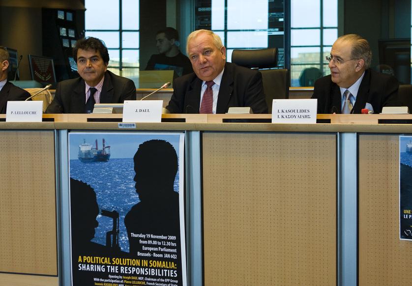 Audition du Groupe PPE sur 'Une solution politique en Somalie: le partage des responsabilités' Joseph Daul, MdPE (France), Président du Groupe PPE au Parlement européen (au centre), Ioannis Kasoulides, MdPE (Chypre), Vice-président du Groupe PPE (à droite), et Pierre Lellouche, Secrétaire d'Etat français chargé des affaires européennes