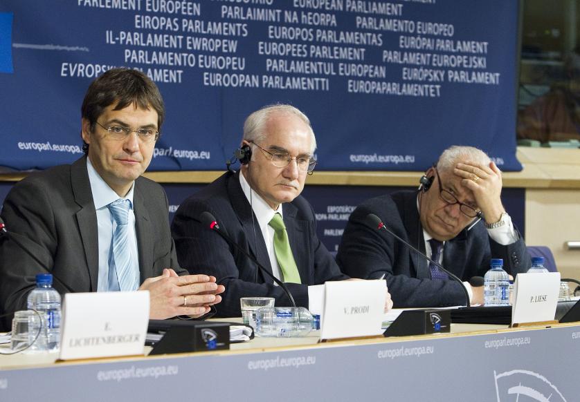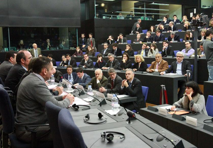 Conférence de presse sur le cas de Battisti de droite à gauche, dans le public: Roberta Angelilli, MdPE (Italie), Vice-présidente du Parlement européen, Mario Mauro, MdPE, Chef de la délégation italienne (PDL) du Groupe PPE au Parlement européen, David-Maria Sassoli, MdPE, Carlo Casini, MdPE, Sergio Paolo Francesco Silvestris, MdPE, et Raffaele Baldassare, MdPE (tous les trois du Groupe PPE, Italie) sont à l'écoute des victimes du terroriste Cesare Battisti