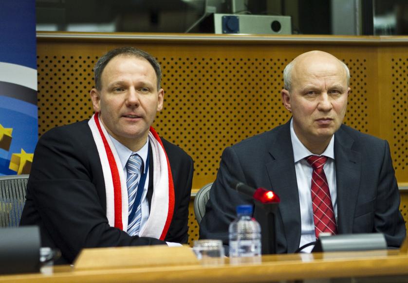 Projection du film 'Le Belarus après les élections présidentielles' Jacek Protasiewicz, MdPE (Groupe PPE, Pologne) (à gauche), et Aleksandr Kozulin, candidat présidentiel 2006, arrêté et emprisonné de 2006 à 2008