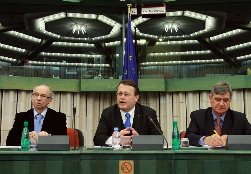 Groupe de travail Paneuropéen du Groupe PPE Paul Rübig, MdPE (Groupe PPE, Autriche), Président du groupe de travail (au centre), Janusz Lewandowski, Commissaire européen pour la Programmation financière et le Budget (à gauche), et Julien Vanderbeeken, Secrétaire général du groupe de travail