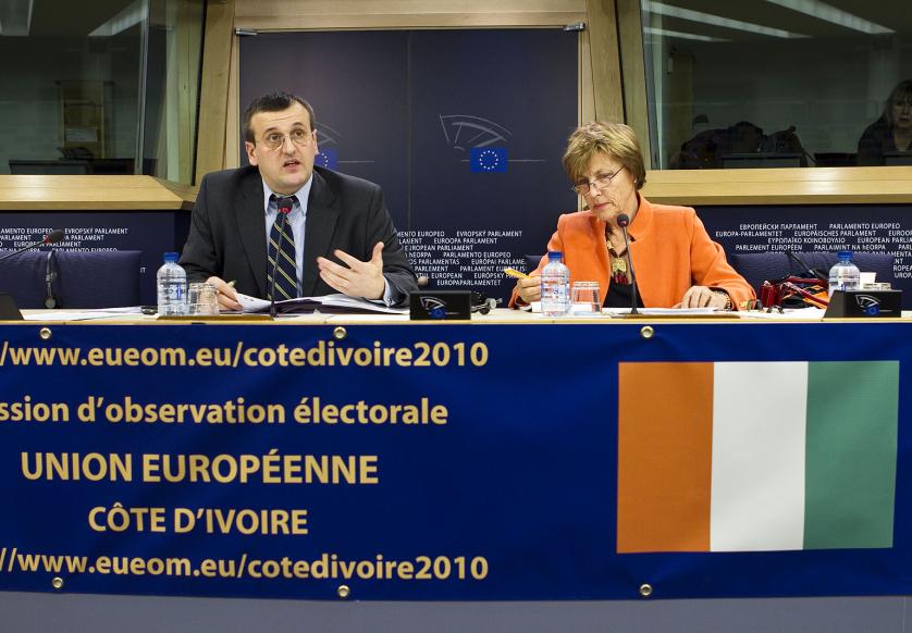 Conférence de presse sur la Mission d'Observation Electorale en Côte d'Ivoire Cristian Dan Preda, MdPE (Groupe PPE, Roumanie) et Anne-Margrete Wachtmeister, attachée de presse, Union européenne - Mission d'Observation Electorale - Côte d'Ivoire