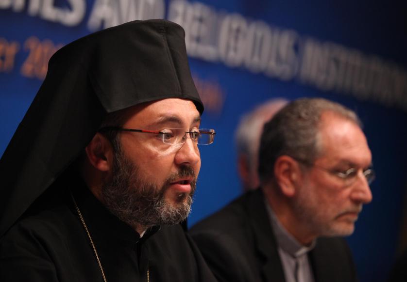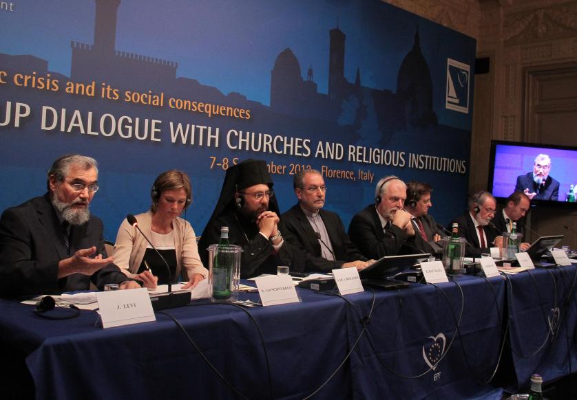 de droite à gauche: Joseph Levi, Grand Rabbin de Florence, Katharina von Schnurbein, Conseillère au Bureau des Conseillers de Politiques européenne, Commission européenne, le Père Archimandrite Aimilianos Bogiannou, Assistant du Directeur du Bureau de liaison de l’Église orthodoxe avec l’Union européenne, Mons. Gino Battaglia, Directeur du bureau pour l'œcuménisme et le dialogue interreligieux de la conférence épiscopale italienne, Jan Olbrycht, MdPE (Pologne), Vice-président du Groupe PPE au Parlement européen responsable du dialogue interculturel et affaires religieuses, Rüdiger Noll, directeur de la Commission Eglise et Société de la Conférence des Eglises Européennes, Jaime Mayor Oreja, MdPE (Espagne), Vice-président du Groupe PPE, et Othmar Karas, MdPE (Groupe PPE, Autriche), Vice-président du Parlement européen