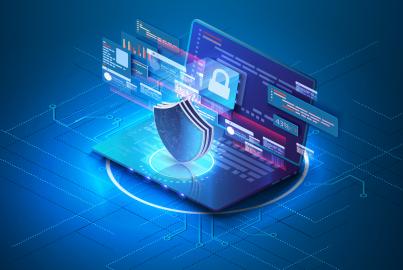 Security Data Protection concept on blue laptop. Isometric digital protection mechanism, system privacy