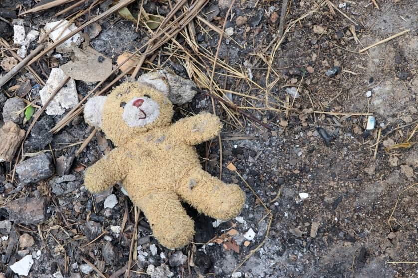 Régi koszos mackó elhanyagoltan a földön a talajon. A gyermekkor vége