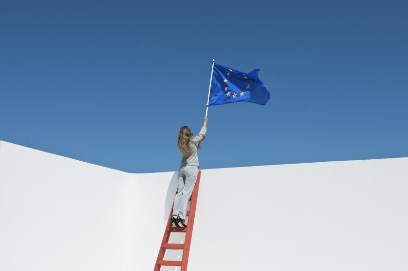 Zakenvrouw bovenaan ladder met vlag van Europese Unie