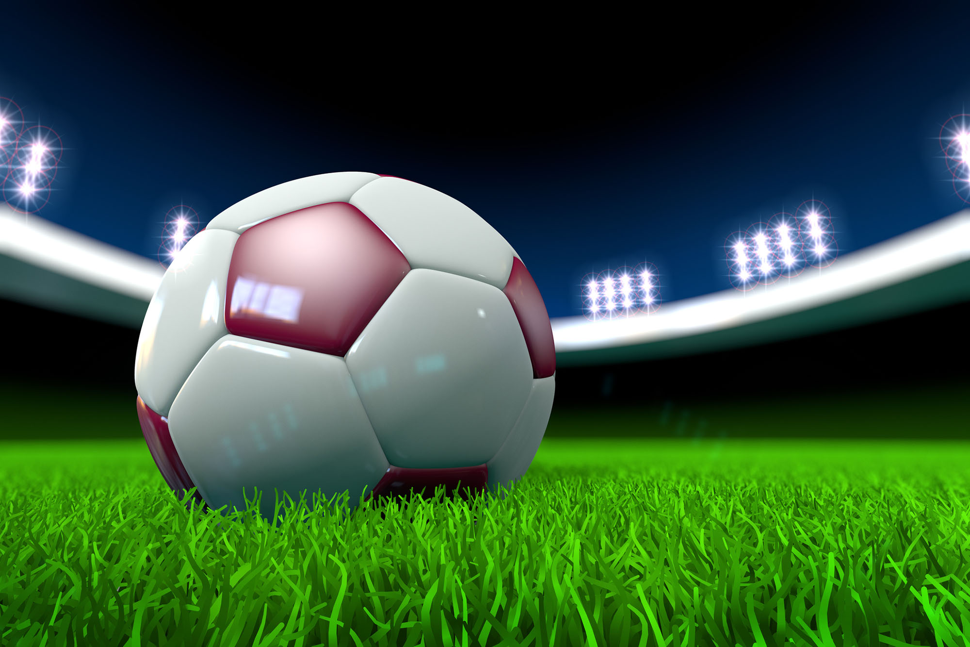 Football ball in the center of football stadium lawn with colors of Qatar World Cup host