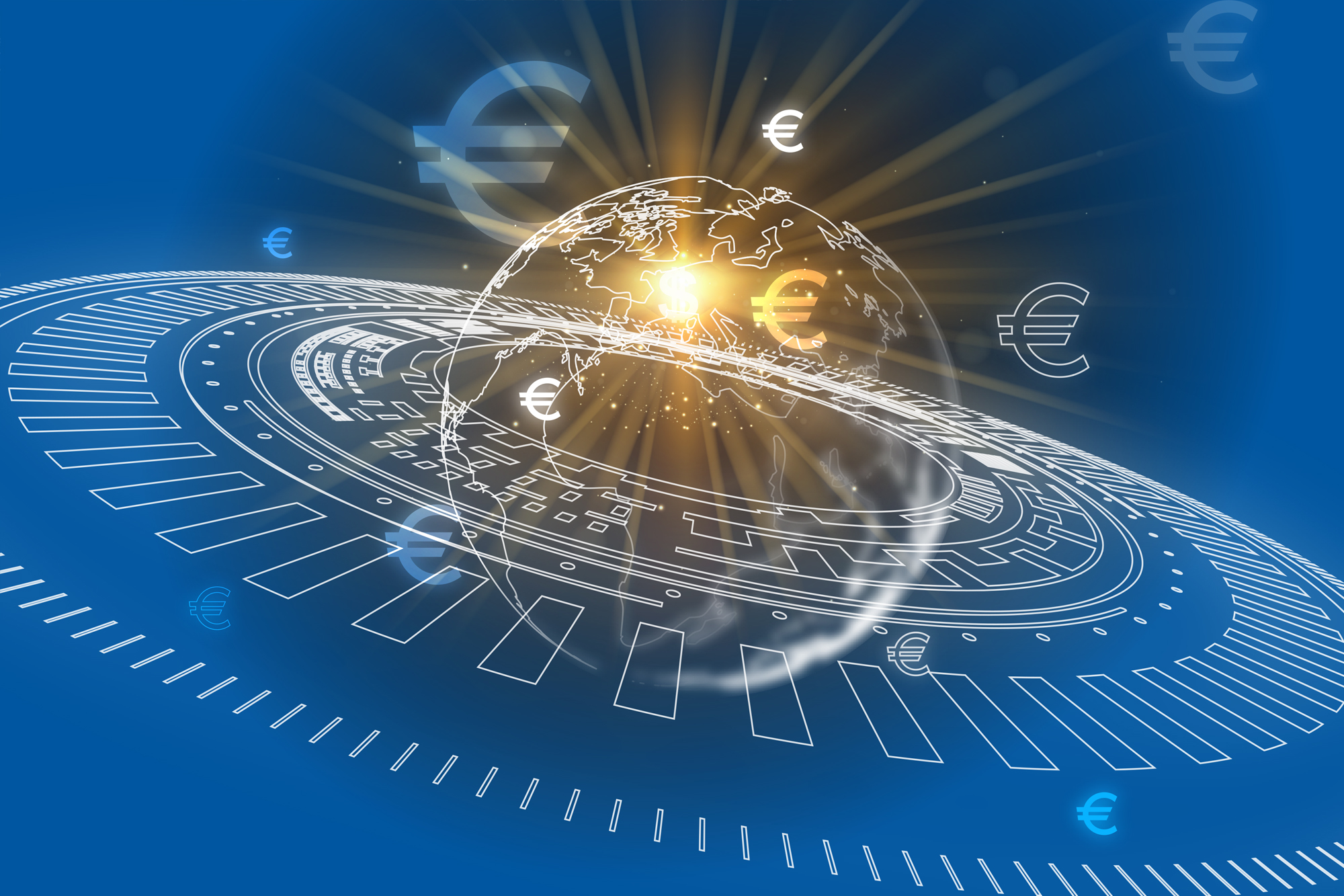 Globe with floating Euro signs over abstract lines on a blue background