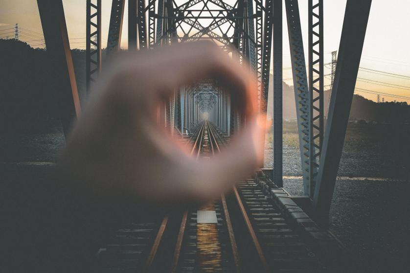 Mão recortada formando um círculo em frente à ponte ferroviária