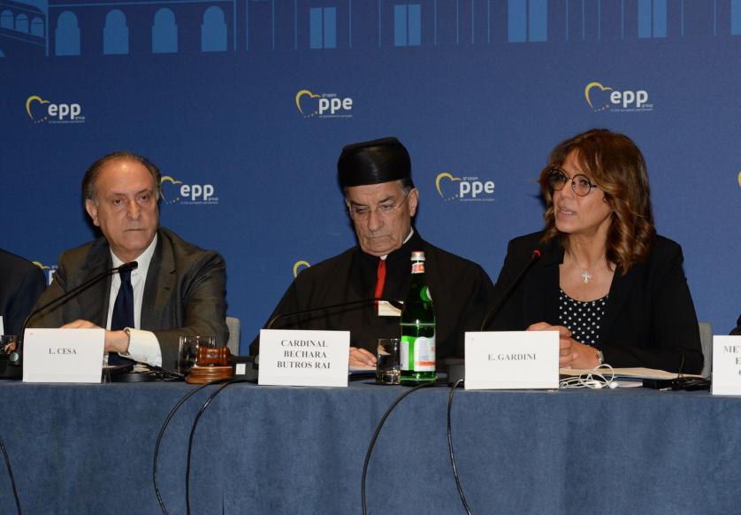 r-l: Elisabetta Gardini MEP, Head of the Italian (FI) Delegation of the EPP Group, Cardinal Bechara Boutros Rai, Maronite Patriarch of Antioch and all the East, and Lorenzo Cesa MEP, Head of the Italian (UDC-NCD-SVP) Delegation of the EPP Group