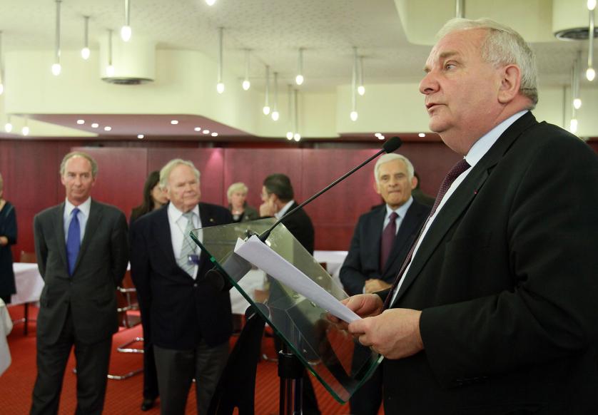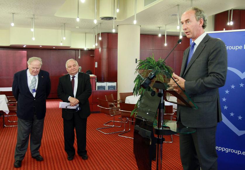 Jean-Dominique Giuliani, Chairman of the Board of Directors of the Robert Schuman Foundation, Paris (speaking), Joseph Daul MEP (France), Chairman of the EPP Group in the European Parliament, and Horst Langes (Germany), former Member of the EPP Group and Honorary President and Co-Founder of the Robert Schuman Foundation, Luxembourg