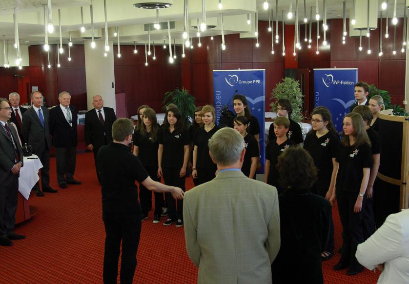 r-l: Joseph Daul MEP (France), Chairman of the EPP Group in the European Parliament (speaking), Jerzy Buzek MEP (EPP Group, Poland), President of the European Parliament, Horst Langes (Germany), former Member of the EPP Group and Honorary President and Co-Founder of the Robert Schuman Foundation, Luxembourg, and Jean-Dominique Giuliani, Chairman of the Board of Directors of the Robert Schuman Foundation, Paris