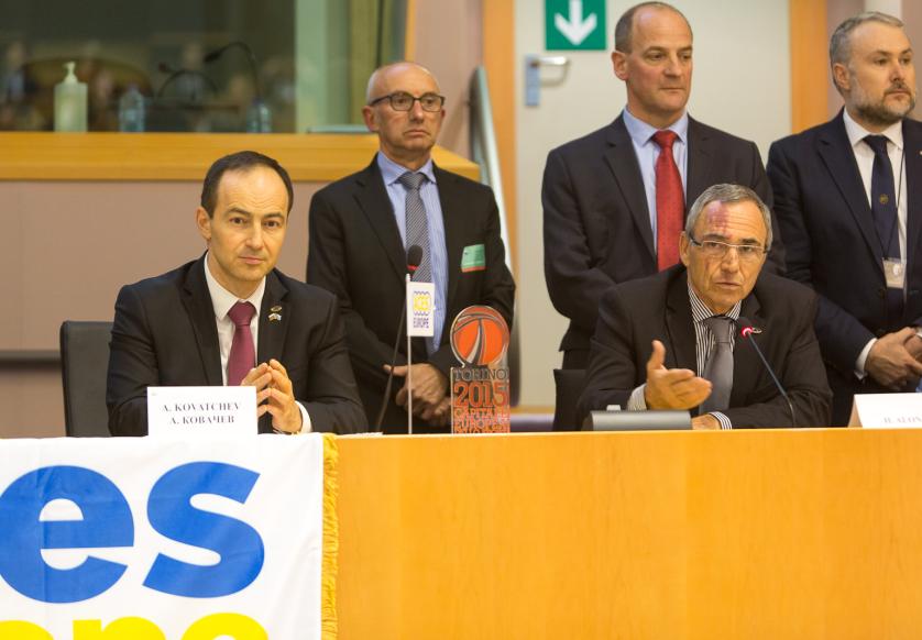 l-r: Jens Nymand Christensen, Deputy Director-General for Education and Culture, European Commission, Santiago Fisas Ayxelà MEP (EPP Group, Spain), Member of the Committee on Culture and Education of the European Parliament, Gian F Lupattelli, President, ACES Europe, Andrey Kovatchev MEP (EPP Group, Bulgaria), Quaestor of the European Parliament, Hugo Alonso, General Secretary of ACES, and Steven De Meyer, Flemish Institute for Sport Management and Recreation Policy, Antwerp
