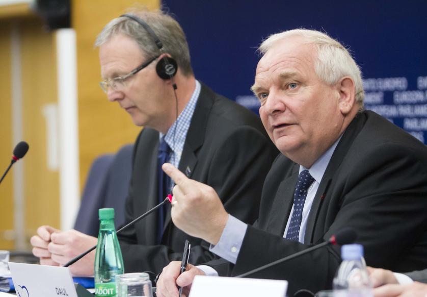 Joseph Daul MEP (France), Chairman of the EPP Group in the European Parliament (speaking), and Axel Voss MEP (EPP Group, Germany)