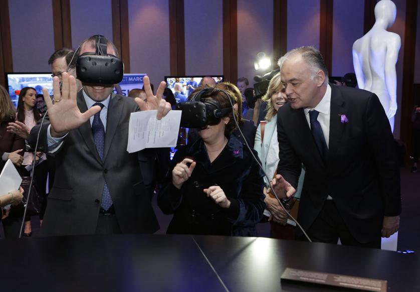 Manfred Weber MEP (Germany), Chairman of the EPP Group in the European Parliament (on the left), and Soraya Sáenz de Santamaría, Deputy Prime Minister of Spain and Minister of the Presidency, trying out innovative technology with Esteban González Pons MEP (Spain), Vice-Chairman of the EPP Group