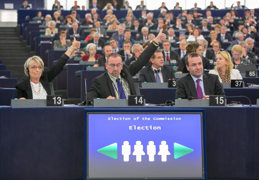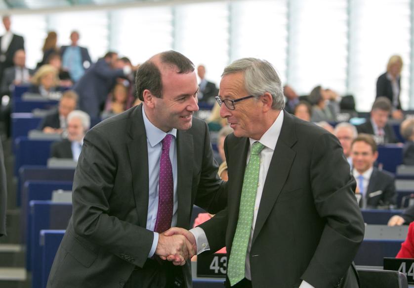 Manfred Weber MEP (Germany), Chairman of the EPP Group in the European Parliament, congratulates Jean-Claude Juncker, President-elect of the European Commission, as his College of Commissioners is approved by the European Parliament