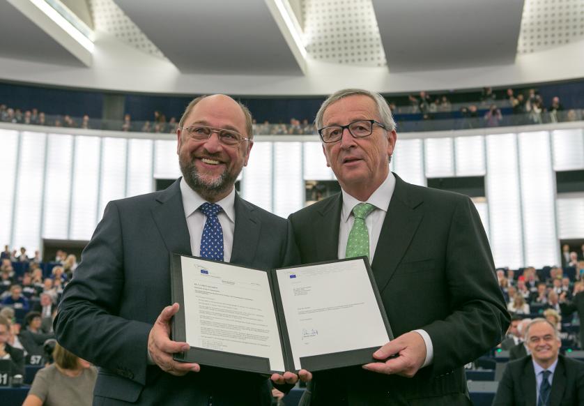 Jean-Claude Juncker, President-elect of the European Commission (on the right), and Martin Schulz MEP, President of the European Parliament, following the approval by the European Parliament of Juncker's new College of Commissioners