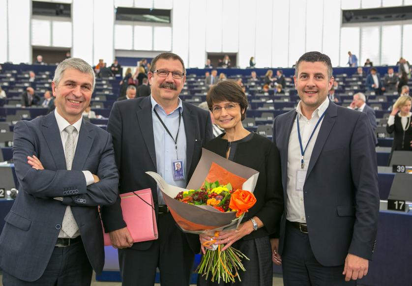 The Belgian Delegation of the EPP Group in the European Parliament (l-r) Ivo Belet MEP, Claude Rolin MEP and Pascal Arimont MEP congratulate Marianne Thyssen MEP on her appointment as European Commissioner for Employment, Social Affairs, Skills and Labour Mobility