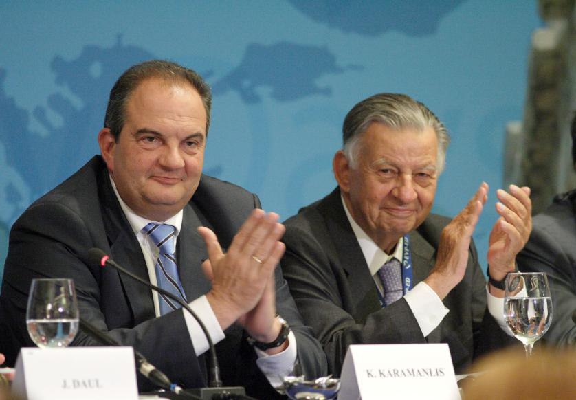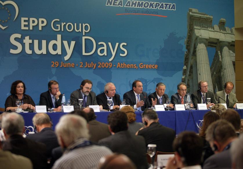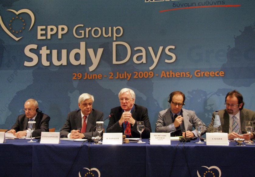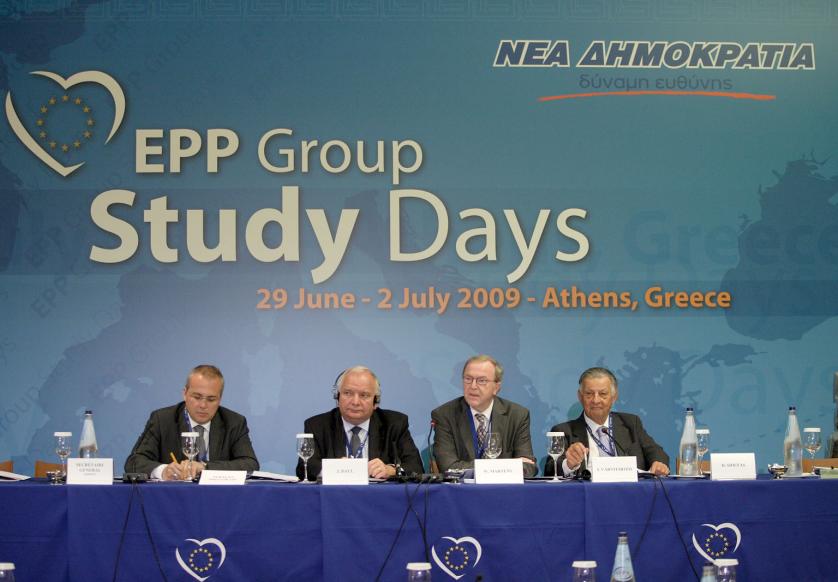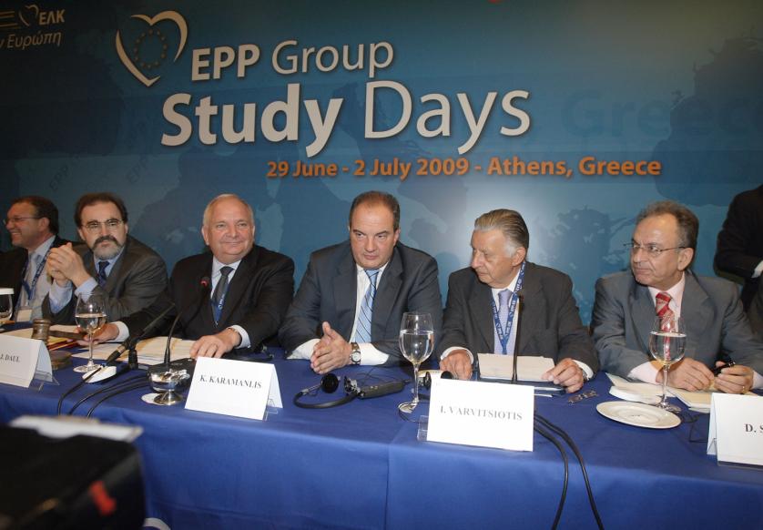 Joseph Daul MEP (France), Chairman of the EPP Group in the European Parliament (4th from left), Kostas Karamanlis, Prime Minister of Greece (in the middle) r-l: Othmar Karas MEP (Austria), Vice-Chairman of the EPP Group, Wilfried Martens, President of the European People's Party, Dimitris Sioufas, Speaker of the Greek Parliament, Ioannis Varvitsiotis MEP, outgoing Head of the Greek Delegation of the EPP Group, Martin Kamp, Secretary-General of the EPP Group, John Biesmans, Deputy Secretary-General of the EPP Group, and Marietta Giannakou MEP, Head of the Greek Delegation of the EPP Group