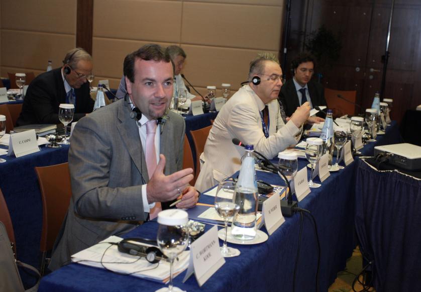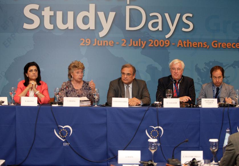 Hartmut Nassauer MEP (Germany), outgoing Vice-Chairman of the EPP Group in the European Parliament (speaking), (l-r) Rodi Kratsa-Tsagaropoulou MEP (EPP Group, Greece), Vice-President of the European Parliament, Viviane Reding, European Commissioner for Information Society and Media, Ioannis Papathanasiou, Greek Minister of Economy and Finance, and Miguel Papi-Boucher, Deputy Secretary-General of the EPP Group