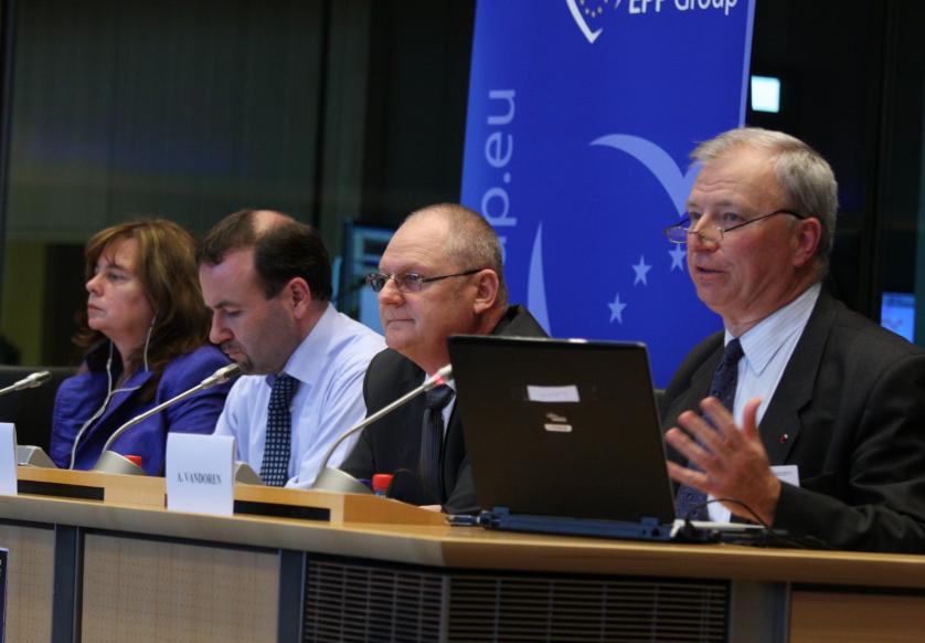 r-l: André Vandoren, Head of the Belgian Coordination Unit for Threat Assessment (OCAM/ OCAD), Ferenc Bánfi, Director of CEPOL (European Police College), Manfred Weber MEP (Germany), Vice-Chairman of the EPP Group in the European Parliament responsibile for Justice and Home Affairs, and Ágnes Hankiss MEP (EPP Group, Hungary)