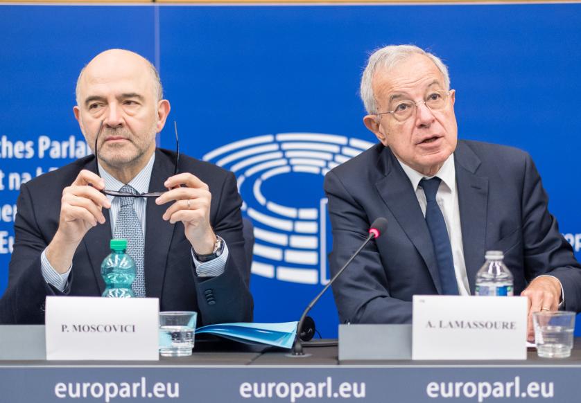 Alain Lamassoure MEP (EPP Group, France), European Parliament Rapporteur on the Common Consolidated Corporate Tax Base, and Pierre Moscovici, European Commissioner for Economic and Financial Affairs, Taxation and Customs
