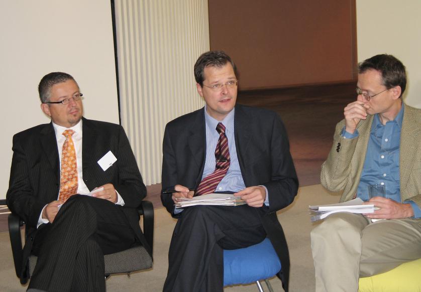 l-r: Professor Dr Peter Huber, Ludwig Maximilians University Munich, Joachim Wuermeling (EPP-ED, Germany), and a journalist