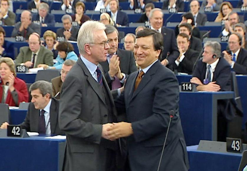 Hans-Gert Poettering, Chairman of the EPP-ED Group in the European Parliament (left), congratulates Commission President José Manuel Barroso after the EP approves the incoming Commissioners