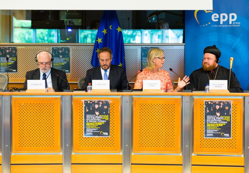 l-r: Jan Olbrycht MEP (Poland), György Hölvényi MEP (Hungary), both Co-Chairmen of the Working Group on Intercultural Relations and Interreligious Dialogue of the EPP Group in the European Parliament, Annie Schreijer-Pierik MEP (EPP Group, The Netherlands) and His Eminence Mor Nicodemus Daoud Sharaf, Syriac Orthodox Archbishop of Mosul