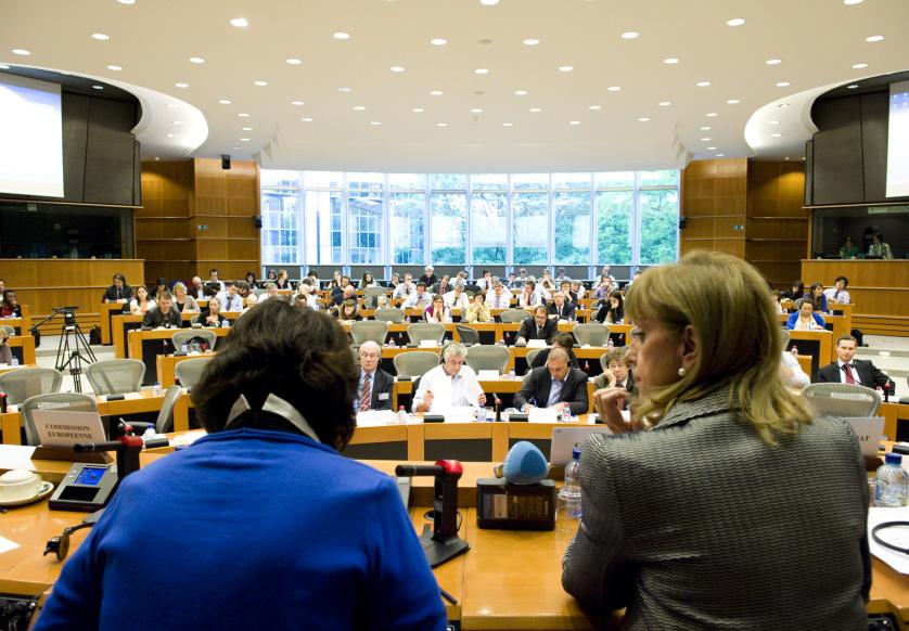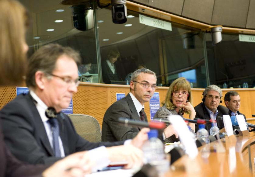 l-r: Maria do Céu Patrão Neves MEP (EPP Group, Portugal), Rapporteur on the Green Paper on the reform of the Common Fisheries Policy, Alain Cadec MEP (EPP Group, France), Vice-Chairman of the Fisheries Committee of the European Parliament, Mauro Belardinelli, EPP Group Secretariat, Carmen Fraga Estévez MEP (EPP Group, Spain), Chairwoman of the Fisheries Committee, Maria Damanaki, European Commissioner for Fisheries and Maritime Affairs, a representative of the European Commission, and Antonello Antinoro MEP (EPP Group, Italy)