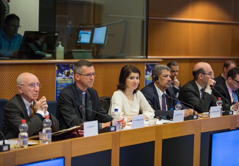 l-r: Thomas Gergely, Professor at ULB and Director of the Martin Buber Judaism Studies Institute, Rev. Olivier Poquillon OP, General Secretary of the Commission of the Bishops' Conferences of the European Union (COMECE), Dr Elizabeta Kitanovic, Executive Secretary for Human Rights of the Conference of European Churches in Brussels (CEC), Salah Echallaoui, Muslim Executive of Belgium (EMB), Vincent Depaigne, Coordinator of the Dialogue with Churches, Religions and Philosophical and Non-confessional Organisations unit, European Commission, and Claude Cahn, Human Rights Officer in the Regional Office for Europe of the Office of the United Nations High Commissioner (OHCHR)