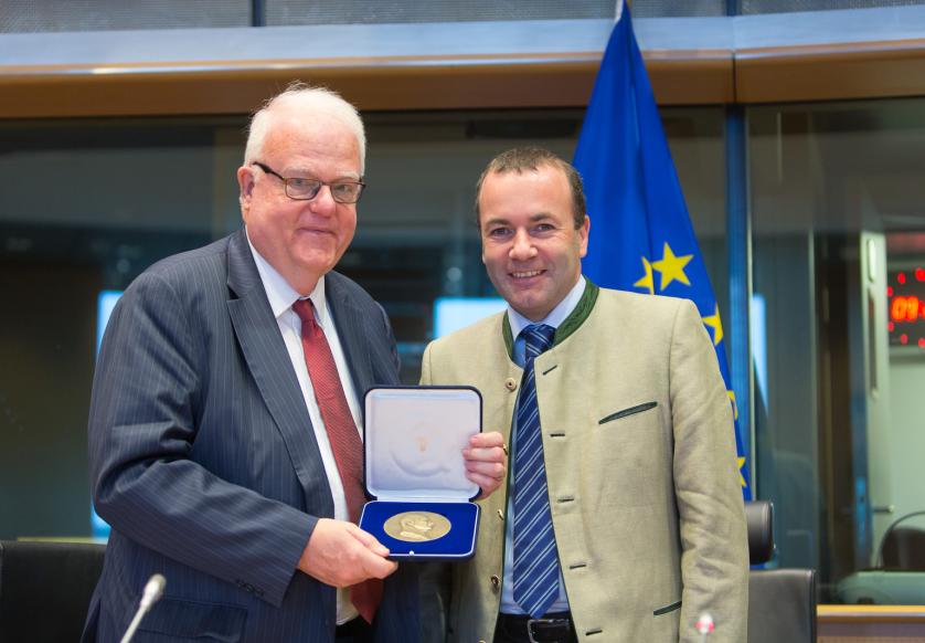 Manfred Weber MEP (Germany), Chairman of the EPP Group in the European Parliament (right), presents US Congressman Jim Sensenbrenner with the Schuman Medal