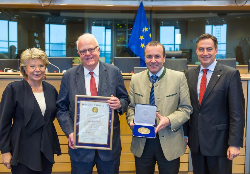 Manfred Weber MEP (Germany), Chairman of the EPP Group in the European Parliament (2nd from right), presents US Congressman Jim Sensenbrenner (2nd from left) with the Schuman Medal together with Viviane Reding MEP (EPP Group, Luxembourg) and David McAllister MEP (EPP Group, Germany)