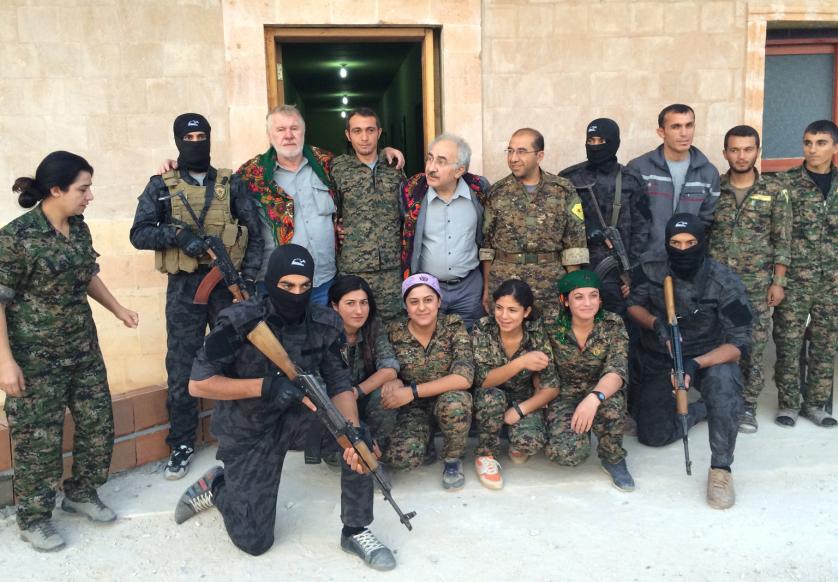Jaromír Štětina MEP (EPP Group, Czech Republic) (3rd from left, back row), Vice-Chairman of the European Parliament's Subcommittee of Security and Defence, with the military command of the People’s Protection Units (YPG) and Women’s Defence Units (YPJ)